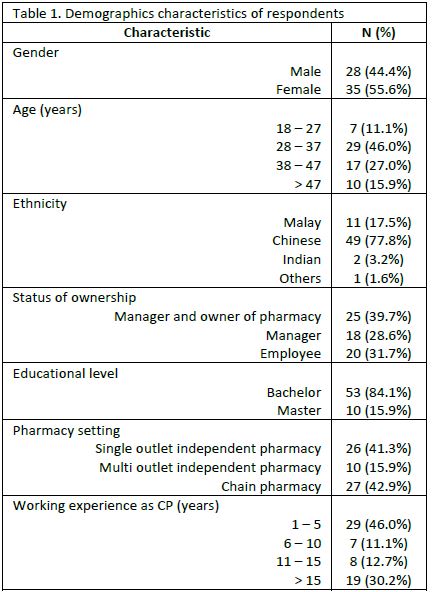 A total of 67 questionnaires were received, giving a response rate of 22.3%. However, only 63 questionnaires were usable. More than half of the responses were received via online (n=36, 53.7%) compare to postage (n=31, 46.3%). Thirty-five respondents were females (n=35, 55.6%) and most of the respondents were manager and owner of the pharmacy outlets (n=25, 39.7%) ( Table 1).