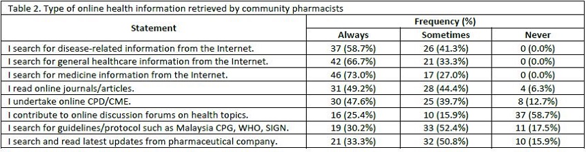 Conclusions: Majority of the respondents expressed positive perception with the use of Internet for health information. The findings of the current study showed the widely use of Internet for health information among community pharmacists. Hence, this study provides opportunity for future works to further examine community pharmacist’s retrieval and appraisal skills for online health information, as well as application of this information into their daily pharmacy practice.