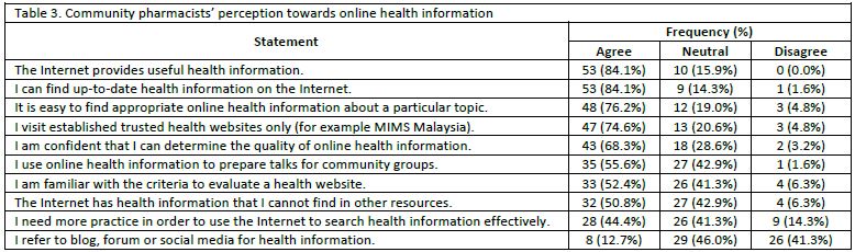 The community pharmacists were required to express their general perception towards online health information. Over half of the respondents agreed with majority of the statements regarding perception of online health information. It was also noted that almost equal number of respondents rated ‘agreed’ (n=28, 44.4%) and ‘neutral’ (n=26, 41.3%) in respond to the need for more practice to seek online health information effectively. When respondents were assessed with regard of referring to social media, blog or forum for health information, majority (n=29, 46.0%) remained neutral to the usage and the rest (n=26, 41.3%) mainly disagreed with the usage of opinion-based source ( Table 3).