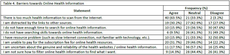 This study had accessed the barriers encountered by community pharmacists when they retrieved online health information. The major obstacle reported by respondents in this study was scanning through abundance of health information from the Internet (n=40, 63.5%). A high proportion of respondents neither trusts blindly nor remains skeptical towards health websites or health information (n=36, 57.1%). Majority of the respondents think that they had no issue with resource (n=32, 50.8%), had appropriate searching skill (n=31, 49.2%), as well as having sufficient time to seek for online health information (n=30, 47.6%) ( Table 4).