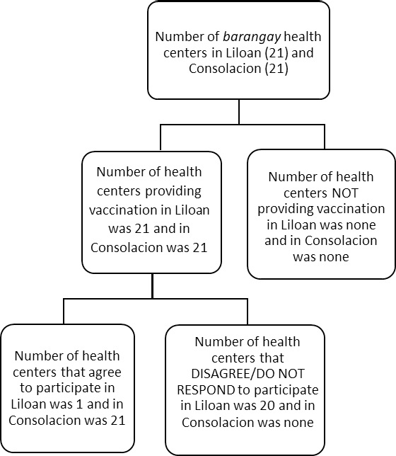 Participants in this study were the personnel-in-charge of each health centers in both towns. A total number of 42 barangay health centers were identified from Liloan and Consolacion. Only health centers that provide vaccination in both towns were included in the study as some health centers do not provide vaccination services. An informed consent was presented to the personnel-in-charge of each health center and those that signed the consent were included in the survey. Thus, health centers that gave their consent were counted as an eligible health center for the study, which was the basis for the sample size ( Figure 1).