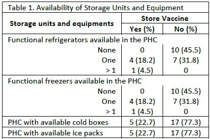 Table 1 presents the availability of storage units and equipment of PHCs surveyed. Out of 22 respondents, only 5 (22.7%) store vaccines. Four out of five have functional refrigerator/freezer; the other carried more than one unit. The other 17 facilities claimed to provide vaccination services but lack the basic equipment essential for storing vaccines as only 7 had at least one functional refrigerator/freezer. All 22 PHCs have cold boxes and ice packs available for 24-hour vaccine storage and transport. As vaccination is part of the service provided by primary health centers, appropriate equipment for storage is important.