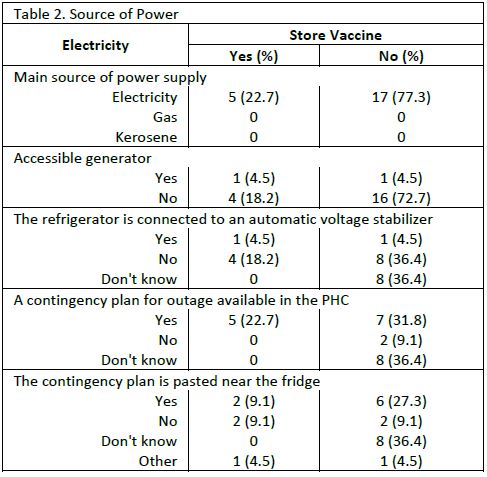 Table 2 shows the power source available and necessary back-ups for the PHCs. All 22 PHCs use electricity as their main power source. Only 1 out of 5 PHCs that store vaccine had a back-up generator for use in the event of power outage. The same trend is seen in the use of an automatic voltage stabilizer. Five PHCs have available contingency plans in case of power outage but only 2 out of 5 posted their plan near the refrigerator.