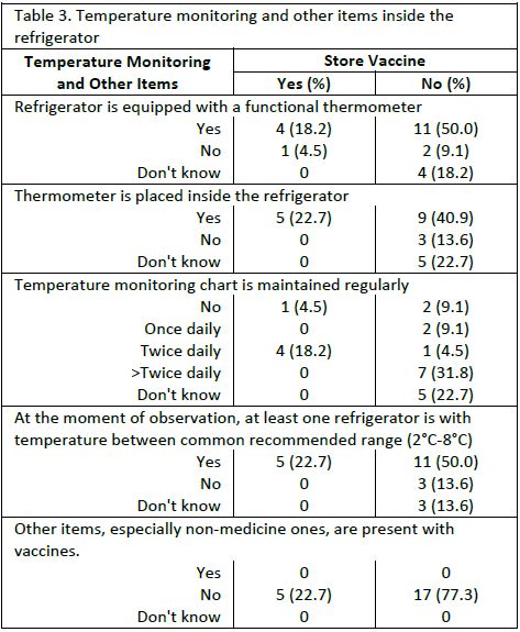 Table 3 lists the temperature monitoring and availability of thermometers. Of the 5 PHCs that store vaccines, 4 have refrigerators equipped with a functional thermometer and they are placed inside the refrigerators. Four PHCs monitor the temperature of the refrigerator twice daily while the other indicated no pattern of monitoring. All 5 PHCs had at least one refrigerator with temperature between 2°C-8°C and only stores vaccine inside.