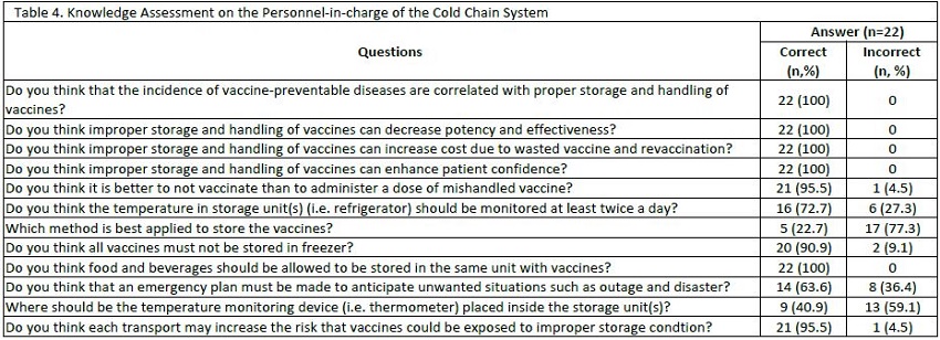 In Table 4, the respondents (n=22) unanimously agreed that incidence of vaccine-preventable diseases are related to improper handling and storage of vaccines; that its potency may decrease when mishandled; that patients’ confidence in the vaccines may decrease and cost due to wastage and re-vaccination increased. Some respondents (77.3%) did not know the best method to store vaccines while 59.1% did not know where the thermometer must be placed in the storage units. Majority of the respondents (95.5%) did not believe that each transport of vaccines may increase the risk of their exposure to improper storage conditions compromising their quality and potency.