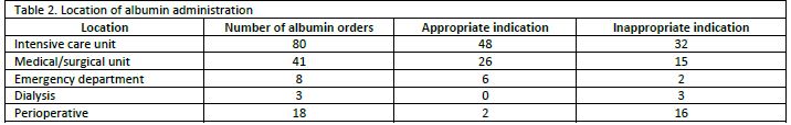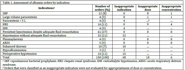 Conclusions: This study identified areas for pharmacist intervention to ensure appropriate albumin utilization, as well as proper dosing for the most frequently incorrectly dosed indications, including hepato-renal syndrome, spontaneous bacterial peritonitis, and paracentesis. This study also identified an unexpected indication with significant inappropriate albumin utilization, perioperative hypotension, which is an area for further intervention to monitor and decrease use.