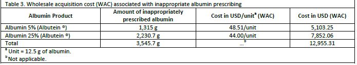 Results: There were 68 instances (45%) where albumin was prescribed inappropriately according to guideline recommendations. Of the 82 instances where albumin was used appropriately, 18 patients received an incorrect dose (22%), and 6 received the inappropriate concentration of albumin (7%). The cost for the 150 patients included in the study associated with inappropriate albumin prescribing was approximately $13,000.