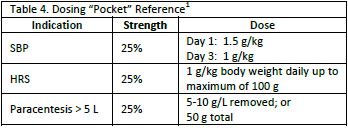 Using this information, a pharmacy driven protocol outlining appropriate albumin use was implemented at our institution to align clinical practice with evidence-based literature and lower the economic impact of albumin, while maintaining the integrity of patient-centered care. Implementation strategies used include a pocket reference card for physicians and pharmacists with the dosing regimens for SBP, HRS, and paracentesis, prescriber education, formulary restrictions, and criteria based ordering. Data will be collected after sufficient implementation of these strategies to assess the impact of this pharmacist driven initiative to decrease albumin use Table 4 shows a pocket reference card created to aid in dosing for these indications.