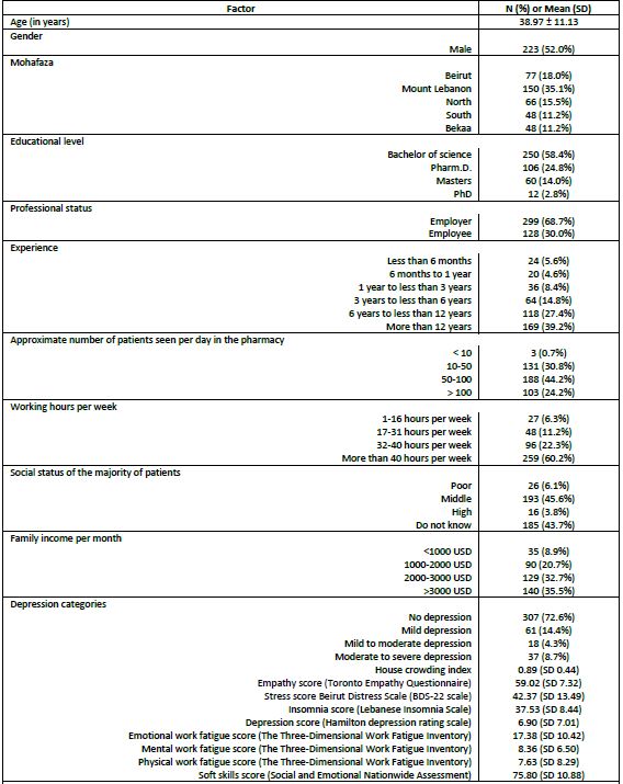 Keywords: Quality of Life, Burnout Professional, Fatigue, Depression, Pharmacies, Pharmacists, Risk Factors, Multivariate Analysis, Surveys and Questionnaires, Lebanon.
