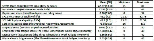 The Cronbach’s alpha values were calculated for all the scales used in the study. The results came as follows: Three-Dimensional Work Fatigue Inventory (3D-WFI) (0.880 for physical work fatigue, 0.710 for mental work fatigue and 0.848 for emotional work fatigue), Toronto Empathy Questionnaire (0.729), Hamilton depression rating scale (0.870), Beirut Distress Scale (0.935), Lebanese Insomnia Scale (0.811) and Soft skills scale (0.757).