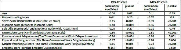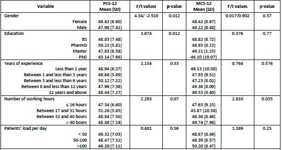 On another hand, a significantly lower mean MCS-12 score was reported by pharmacists working between 17 and 31 hours per week as compared to those working >40 hours per week (p=0.035). Increased depression (Hamilton depression score; r= -0.3) stress (BDS-22; r= −0.39), insomnia (r=-0.36) and burnout (emotional component r= -0.16; physical component r= -0.14; mental component r= -0.23) were drastically correlated to lower mental QoL score (MCS-12). However, age was correlated with higher MCS-12 score (r= 0.1).
