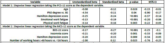 PCS-12 score was considered as dependent variable for the first stepwise linear regression. It showed that higher age (Beta= -0.08), having a PhD degree compared to a bachelor in science one (Beta=-4.54), higher depression score (Beta= -0.25), higher emotional work fatigue (Beta= -0.13) and higher physical work fatigue (Beta= -0.14) were significantly associated with lower physical QoL (lower PCS-12 scores) ( Table 5, Model 1).