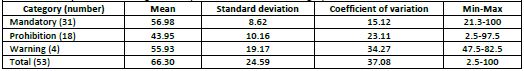 Descriptive statistics of guessability scores for the pictograms in Mandatory, Prohibition and Warning categories are summarized in Table 1. The overall guessability score for all pictograms was 66.30% (SD=24.59). On average, the guessability score was greater for the Mandatory signs, followed by the Warning signs. The lowest guessability score belonged to the prohibition signs, which were also found to have the widest spread in guessability and the highest coefficient of variation.