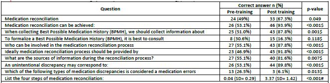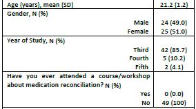 Among the 60 students who registered to participate in the study, 49 attended the educational training (response rate 81.6%). Female represented 51.0% of the study sample (n=25) and the majority of students were in their third year of study (n=42, 85.7%). None of the students had ever attended a course/workshop about medication reconciliation ( Table 1).