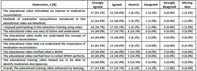 Finally, the majority of students (n=44, 89.8%) were satisfied with the overall training process, where 91.8% (n= 45) believed that the educational video made them understand the concept of medication reconciliation, and 93.9% satisfied that educational video helped them to understand the importance of medication reconciliation ( Table 3).