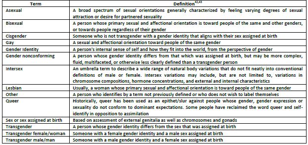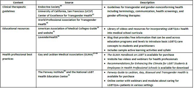 In a nursing curriculum framework to integrate LGBTQIA+ health content, faculty did not consider themselves experts on the material and instead utilized external resources. 22 Feedback from faculty highlighted the potential benefit of continuing education on transgender health topics in the future. Overall, the framework was well received by faculty and students alike. 22 Faculty can reference many resources to become comfortable with terminology ( Table 1) and patient care ( Table 2). Additionally, faculty can consider collaborating with members of their local LGBTQIA+ community from Safe Zone training programs, clinics, community centers, or organizations to serve as guest lecturers, discussion panel members, or to consult on covered topics. 18, 22- 31