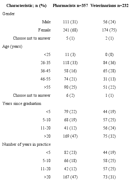 Pharmacist and veterinarian respondents differed significantly with regard to age, number of years since graduation, and number of years in practice. The two groups were similar with regard to gender, with the majority of respondents being female. Sixty-eight percent of pharmacist respondents practice in a chain pharmacy setting and 25% practice in an independent pharmacy setting. Half of all pharmacist respondents have a Doctor of Pharmacy degree. Of the veterinarian respondents, 75% work in a private practice setting and 17% work in a corporate practice setting. The remainder practice in some other community setting, including shelters and nonprofit clinics. All veterinarian respondents have a degree in veterinary medicine. Respondent characteristics are reported in Table 1.