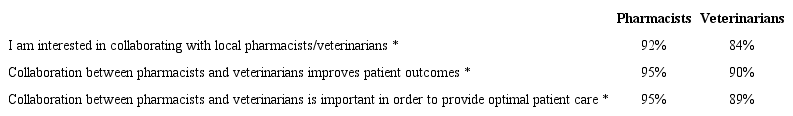 Methods: Cross-sectional surveys were sent to pharmacists and veterinarians who practice in a community setting in Ohio. Surveys collected demographic information and addressed the following themes: attitudes toward collaboration, perceived roles of the pharmacist, expectations of the pharmacist, and previous collaborative experiences. A chi-square test was used for statistical analysis.