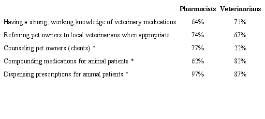 Results also revealed differences between pharmacists and veterinarians with regard to the perceived roles of the community pharmacist involved in the care of veterinary patients. Notably, a relatively low percentage of pharmacist respondents perceive their role as inclusive of compounding for veterinary patients. Even though nonsterile compounding is a common component of pharmacy student training, the translation of these skills for use in veterinary patients may not be made apparent within pharmacy school curricula. Given that a large percentage of veterinarian respondents perceive this as an important role of the pharmacist, this may be an area in which pharmacists can demonstrate a more unique skill set and begin to develop better relationships with local veterinarians through the provision of compounding services. Findings in the literature are encouraging: a recent study found veterinarians and clients agree that pets and clients would benefit from community pharmacies providing compounding services and that pharmacists may be able to fill a need for veterinarians by providing these services. 15