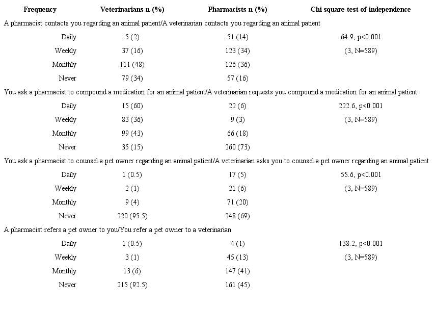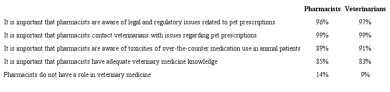 Results: In total, 357 pharmacists and 232 veterinarians participated in the study. Both professions agreed that pharmacist-veterinarian collaboration is important in order to optimize veterinary patient care (chi-square (1, N=589)=7.7, p=0.006). Overall, veterinarians were more likely to identify an important role of the community pharmacist to be compounding medications (chi-square (1, N=589)=26.7, p<0.001) compared to counseling pet owners (chi-square (1, N=589)=171.7, p<0.001). Both groups reported similar levels of agreement regarding the importance for pharmacists to have adequate knowledge of veterinary medicine.