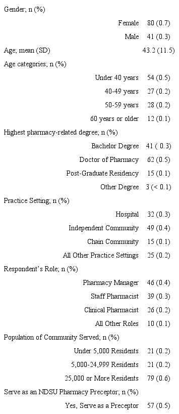 Descriptive statistics for all respondent demographics are presented in Table 1. Within the sample, 70% of respondents were female and 30% were male. The mean age of respondents was 43.2 years of age. Approximately 70% of respondents were less than 50 years of age. Approximately 50% of respondents held a Doctor of Pharmacy as their highest degree, while approximately 30% held a bachelor degree in pharmacy. A plurality of pharmacists (40%; n=49) reported working in an independent community setting, while another 26% (n=32) worked in a health system setting, and only 12% (n=15) reported working in a chain community pharmacy. These percentages are consistent with the pharmacy profession in North Dakota. More specifically, North Dakota has a legal requirement that (except for a few stores that were operating prior to the passage of the law) all community pharmacies in the state be majority owned by pharmacists licensed in the state. 18 With regard to position, 38% (n=46) reported holding the position of pharmacy manager, 32% (n=39) reported working as staff pharmacists, 21% (n=26) as clinical pharmacists, and 8% (n=10) in other practice settings. Approximately 60% of pharmacists work in urban communities and 40% in rural communities. Fifty percent of all respondents serve as preceptors for pharmacy students attending the state’s lone school of pharmacy.