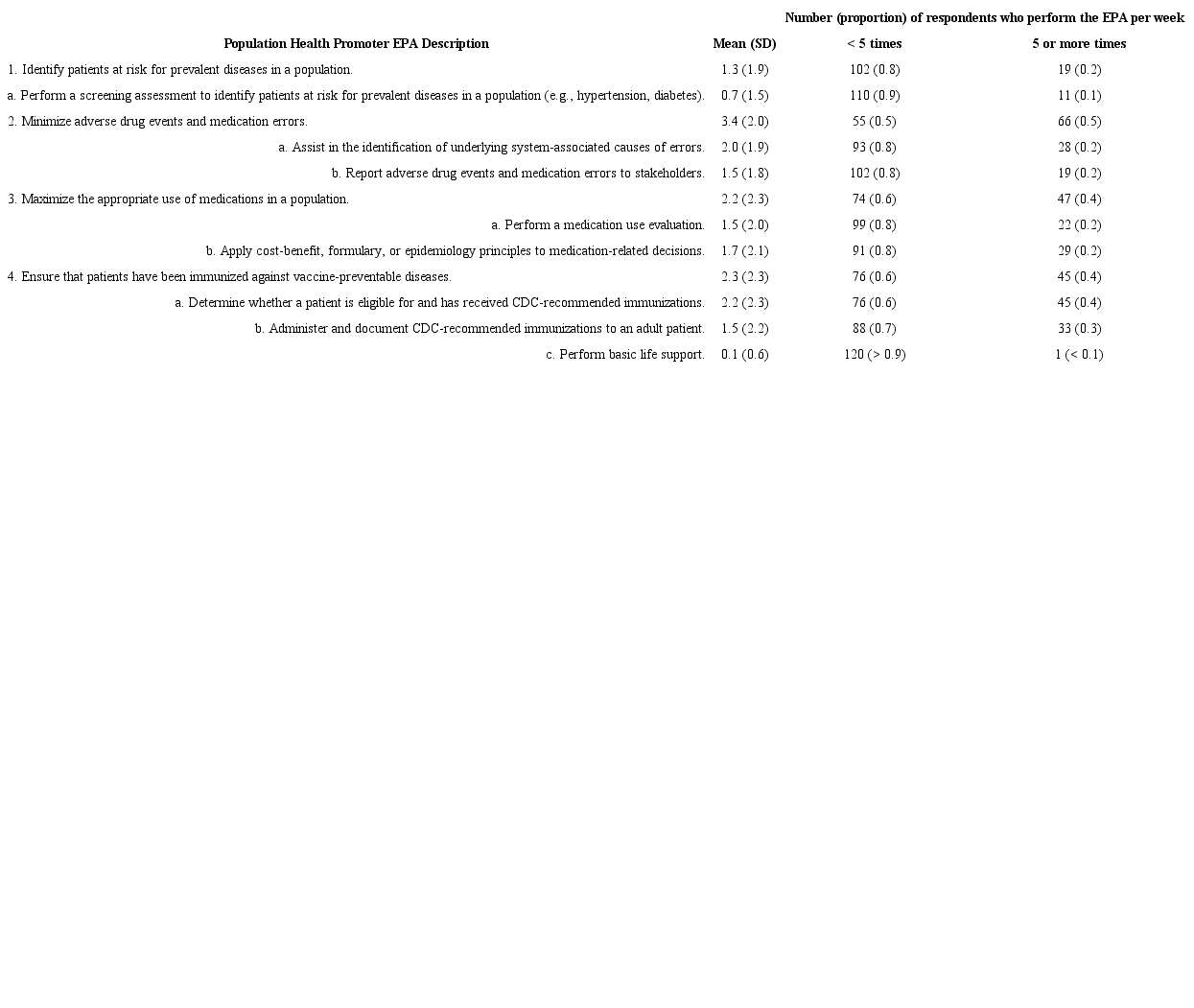 The survey’s design creates a fourth limitation. It is difficult to obtain reliable self-reported frequencies from many respondents using a question with a limited response scale. In the case of the PHP EPA items, a 6-point response scale (0,1,2,3,4,5 or more times) was utilized. If the respondent performs a task infrequently, the survey provides valid and reliable inferences. But for tasks performed regularly, the responses become truncated on the right-hand side of the response scale. This type of truncation limits the information that can be gleaned from the survey. Futures surveys that utilize different response scales that are theoretically appropriate and avoid the possibility of truncation would provide deeper and more meaningful inferences than are contained in the current manuscript.