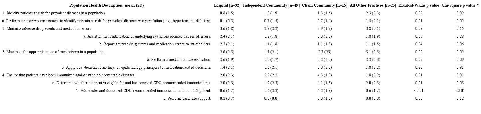 An analysis of responses by practice setting is presented in Table 3. The most commonly reported activity across practice settings was “Minimize adverse drug events and medication errors.” No significant differences exist across practice settings, suggesting that pharmacists in every setting perform this task with similar frequency. Significant differences were noted among practice settings for “Identify patients at risk for prevalent diseases in a population” (Kruskal-Wallis p=0.02; chi-square p=0.02), “Maximize the appropriate use of medications in a population” (Kruskal-Wallis p=0.02; chi-square p=0.02), and “Ensure that patients have been immunized against vaccine-preventable diseases” (Kruskal-Wallis p=0.01; chi-square p=0.01). When examining statistically significant differences across practice settings for these Core PHP EPAs, pharmacists working for chain pharmacies generally reported the highest mean values, while those working for independent community pharmacies reported and lowest means.