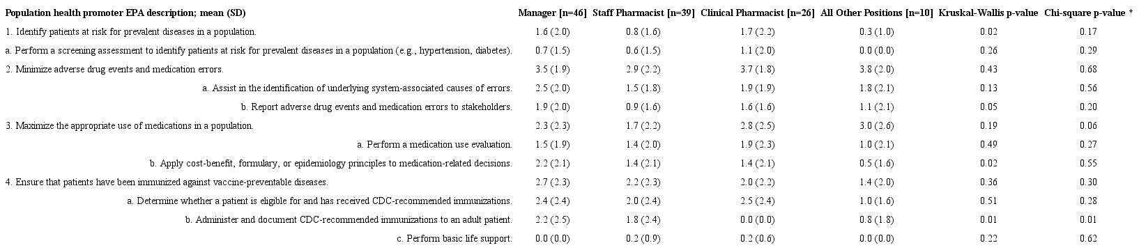 Table 4 contains an analysis of responses, disaggregated by position. As in Table 3, the item pharmacists reported the highest mean frequency was “Minimize adverse drug events and medication errors”. However, these differences were not statistically significant (Kruskal-Wallis p=0.43; chi-square p=0.29). The next most commonly undertaken item was “Maximize the appropriate use of medications in a population,” which also did not differ significantly by position type (Kruskal-Wallis p=0.19; chi-square p=0.06). Statistically significant differences by position did exist for the core EPA PHP domain “Identify patients at risk for prevalent diseases in a population” (Kruskal-Wallis p=0.02; chi-square p=0.17). In general, clinical pharmacists and pharmacy managers reported undertaking activities and tasks more frequently than staff pharmacists.