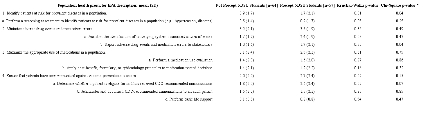 In our study, the PHP EPAs were also reported by preceptor status (NDSU School of Pharmacy preceptor and non-preceptor). In the first core PHP EPA “Minimize adverse drug events and medication errors,” one of two supportive tasks: “Assist in the identification of underlying system-associated causes of errors” was statistically significant, with NDSU preceptors performing those tasks more frequently, than did non-NDSU preceptors. In the second core PHP EPA “Identify patients at risk for prevalent diseases in a population,” the supportive task “Perform a screening assessment to identify patients at risk for prevalent diseases in a population (e.g., diabetes),” showed a statistically significant difference for preceptors more than non-preceptors. This difference may be explained by the availability of human resources. For example, pharmacists may be assigned students on a regular basis precisely because they can have greater time and other resources to reallocate their efforts away from “traditional” activities, and towards other aims, including activities in the PHP domain and precepting students. Precepting students may also create synergies which lead to pharmacists undertaking activities within the PHP domain. As an example, students often take the lead on performing the assessments while being supervised by a pharmacist. This supervisory role is less time consuming, and more efficient than performing the entire screening process by themselves. Consequently, this process often allows for additional overall services to be provided by the pharmacy.