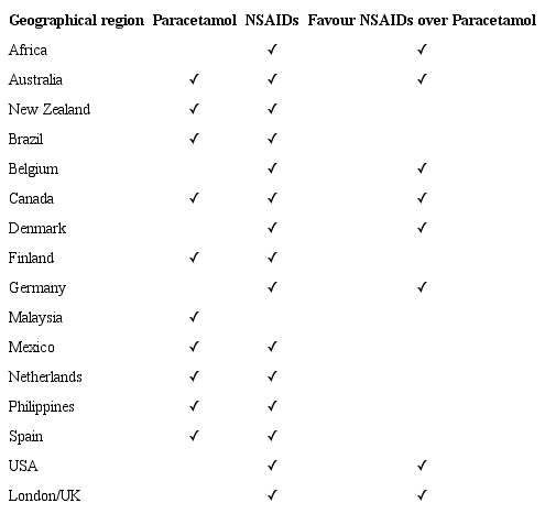 Many international clinical resources also reinforce that although NSAIDs are more effective, they are not without harm. Numerous literature investigating clinical pain management guidelines in North America, Asia, Africa and Europe found that many countries actually favour the use of NSAIDs in LBP. 15, 18, 20, 28, 29 One study published in 2018 highlighted that of the 15 countries involved in analysis, 14 countries recommended NSAIDs in their clinical guidelines for the management of LBP. 15 Despite there being 8 international clinical guidelines that support the use of paracetamol, Belgium, Denmark, Germany, United Kingdom and the United States of America hold clinical guidelines that advise against the use of paracetamol in LBP casses. 18, 20, 29- 31 A summary of this information is provided in Table 1. New Zealand clinical guidelines on the management of LBP suggest the use of either paracetamol or the NSAID aspirin as a first-line option, however, these clinical guidelines also suggest that from a therapeutic perspective, all NSAIDs are equally effective and health professionals can recommend whichever NSAID they deem suitable. 19 In contrast to this, while the NICE guidelines which are adopted in the United Kingdom strongly advise against the use of paracetamol alone, these guidelines highlight that the choice of NSAID is crucial. 32 Health professionals are advised to profile the patient’s risk factors in relation to gastrointestinal, cardiovascular and renal function and recommend the most appropriate NSAID at the lowest dose according to these risk factors. 32 LBP guidelines adopted in the United States (e.g. American College of Physicians) and Canada are also consistent with this argument, emphasising that the use of the most appropriate NSAID for a specific patient is recommended with the core aim of allowing the patient to return to normal activities and work as soon as possible. 33, 34 It is interesting to highlight that clinical guidelines have evolved over the past 20 years. As is the case with Australian therapeutic guidelines, many international clinical guidelines historically showed favour in the recommendation of paracetamol as a first-line treatment option, with NSAIDs reserved as second line options. 7, 35, 36 The negative profile associated with NSAIDs appears to have shifted in light of the fact that NSAIDS seem to be more widely adopted in clinical guidelines in the area of LBP management.