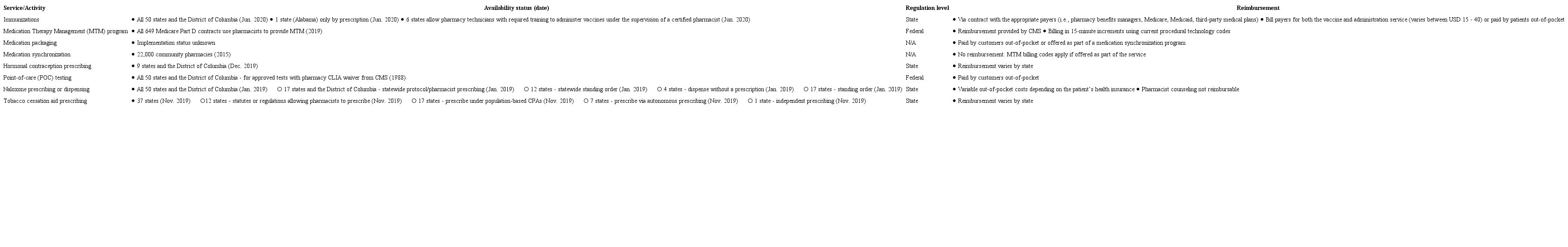 The Community Pharmacy Enhanced Services Network (CPESN) is a clinically integrated network of community pharmacies (mostly independent), that resulted from the expansion of the Community Care of North Carolina in 2014 with funding from a 3-year grant by the Centers for Medicare and Medicaid Innovation (CMMI). The goal was to provide a structure for community pharmacies to expand primary care efforts, as well as a means to negotiate reimbursement for services with payers as a group. 37, 38 This model has now spread to 44 states and includes 2,700 community pharmacies that offer enhanced services for high-risk patients. The core services that pharmacists are required to offer to be a part of the network include medication reconciliation, medication synchronization, immunizations, comprehensive medication reviews, face-to-face access to a pharmacist, and creating a comprehensive medication list. Additional enhanced services provided by select pharmacies comprise: 24-hour emergency services, collection of vital signs, home delivery/home visits, tobacco cessation program, durable medical equipment, point-of-care testing, long-acting injections, naloxone dispensing, nutritional counseling, and specialty medication compounding. 39 To the best of our knowledge, no public information exists regarding the percentage of pharmacies providing each of the services and the reimbursement rates negotiated (if any) for each service across states. Several challenges were reported by pharmacists in the North Carolina CPESN offering medication management services related with initiating services, accessing internal and external information, documenting, among others. This same study found that 73 (59.3%) of the 123 participating pharmacies did not complete service requirements within the first 3 months. 40