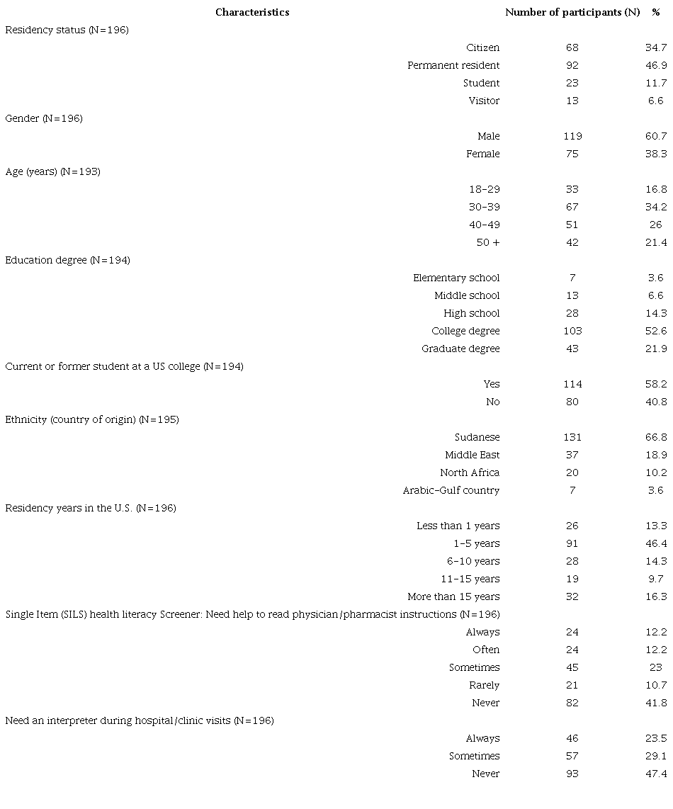 We received 196 surveys from adult native Arabic speakers who lived in Johnson County, Iowa, USA during fall 2017. Participants gender and ethnicity are detailed in Table 1. The participants were all native Arabic speakers who have been residing in the U.S. for varying durations ranging from less than a year to more than 15 years ( Table 1).