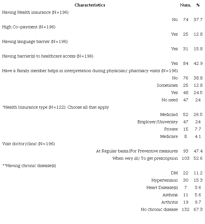 Lack of insurance subjects individuals to the economic burden of needed medical care expenses and pertains to infrequent or no regular checkups and screenings for major health problems like diabetes mellitus (DM), cardiovascular diseases, and cancer. 4, 5 Minorities have been reported to largely contribute to the uninsured population in the U.S. and this was attributed to low income or new arrival. 6 Lack of health insurance was one of the main barriers to accessing healthcare for Latinos in South Carolina. 7 and was found to correlate positively with having a regular healthcare provider and completing diagnostic tests for African Americans. 8 Similarly, unaffordable healthcare services were reported as a barrier to healthcare services by Arab Americans in Brooklyn as well as other minorities. 7, 9