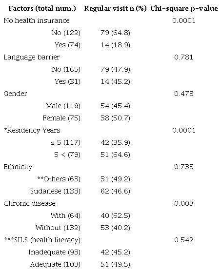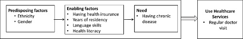 In summary, these findings denote the significance of health insurance and years of residency as enabling factors and existence of chronic disease as a need factor for seeking preventive/regular physician visits. However, health literacy, language barriers, gender and ethnicity had no significant association with performing preventive physician visits ( Table 3).