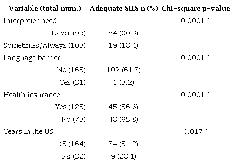 The chi-square analysis showed that there were significant (p< 0.05) relationships between health literacy level and both language barrier and interpreter need ( Table 4). To elaborate, almost all participants with limited English proficiency (30/31) were also specified as having inadequate health literacy. On the other hand, more than one-third (63/165) of the participants who reported having no language barrier were designated as having inadequate health literacy according to SILS results (answered sometimes, often or always need help in understanding health-related materials). Considering the association between using an interpreter service and health literacy, we found that 81.6% (84/103) of those reported needing an interpreter were considered to have low health literacy and the remaining 18.4% (19/103) of those who needed an interpreter were considered to have good health literacy ( Table 4).