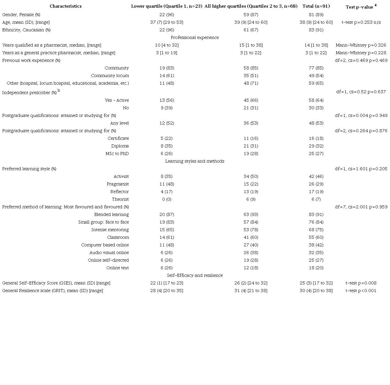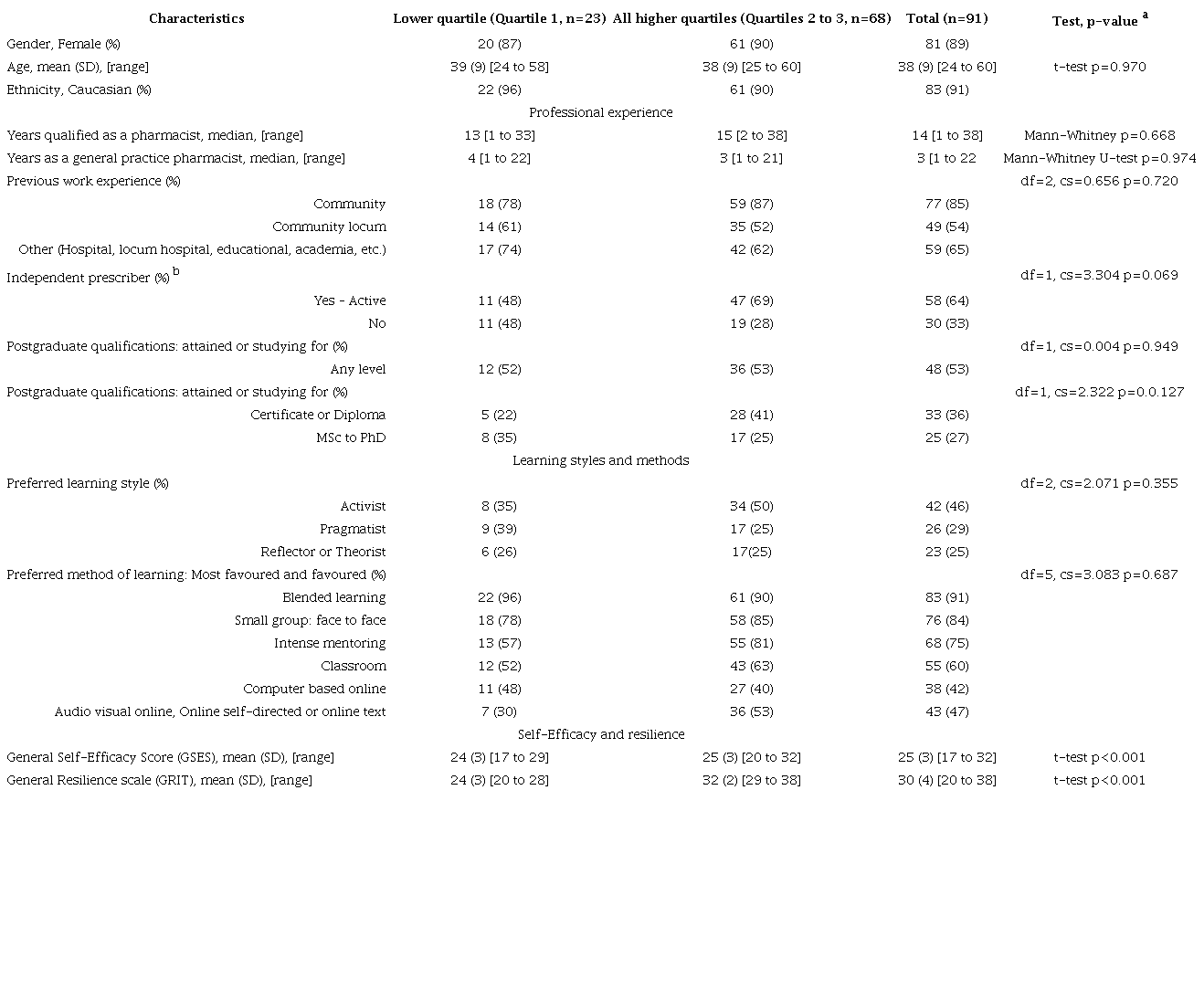 Methods: All 159 NHS Greater Glasgow and Clyde general practice pharmacists were invited to complete an online survey in May 2019. The survey captured anonymised data covering: demographics; professional experience; qualifications, prescribing status and preferred learning styles. Unconscious learning needs for behavioural and influencing skills were assessed using validated tools: the new general self-efficacy scale (GSES) and short general resilience scale (GRIT). Participants’ responses were differentiated by the lowest quartile and higher quartiles of GSES and GRIT scores, and analysed to identify differences.