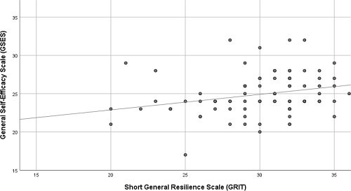 The respondents scored highly for self-efficacy (GSES mean of 25 (SD 3; 95%CI 24.4-25.6) and GRIT mean of 30 (SD 4; 95%CI 29.6-30.4), out of a maximum 32 and 40 respectively. No significant differences were identified between the characteristics of the pharmacists categorised in the lowest quartile and the higher quartiles by self-efficacy ( Table 2) or resilience ( Table 3). A significant positive correlation was identified between GSES and GRIT scores (Preason’s r=0.284, p=0.006), indicating that increases in self-efficacy correlated with increases in resilience ( Figure 1).