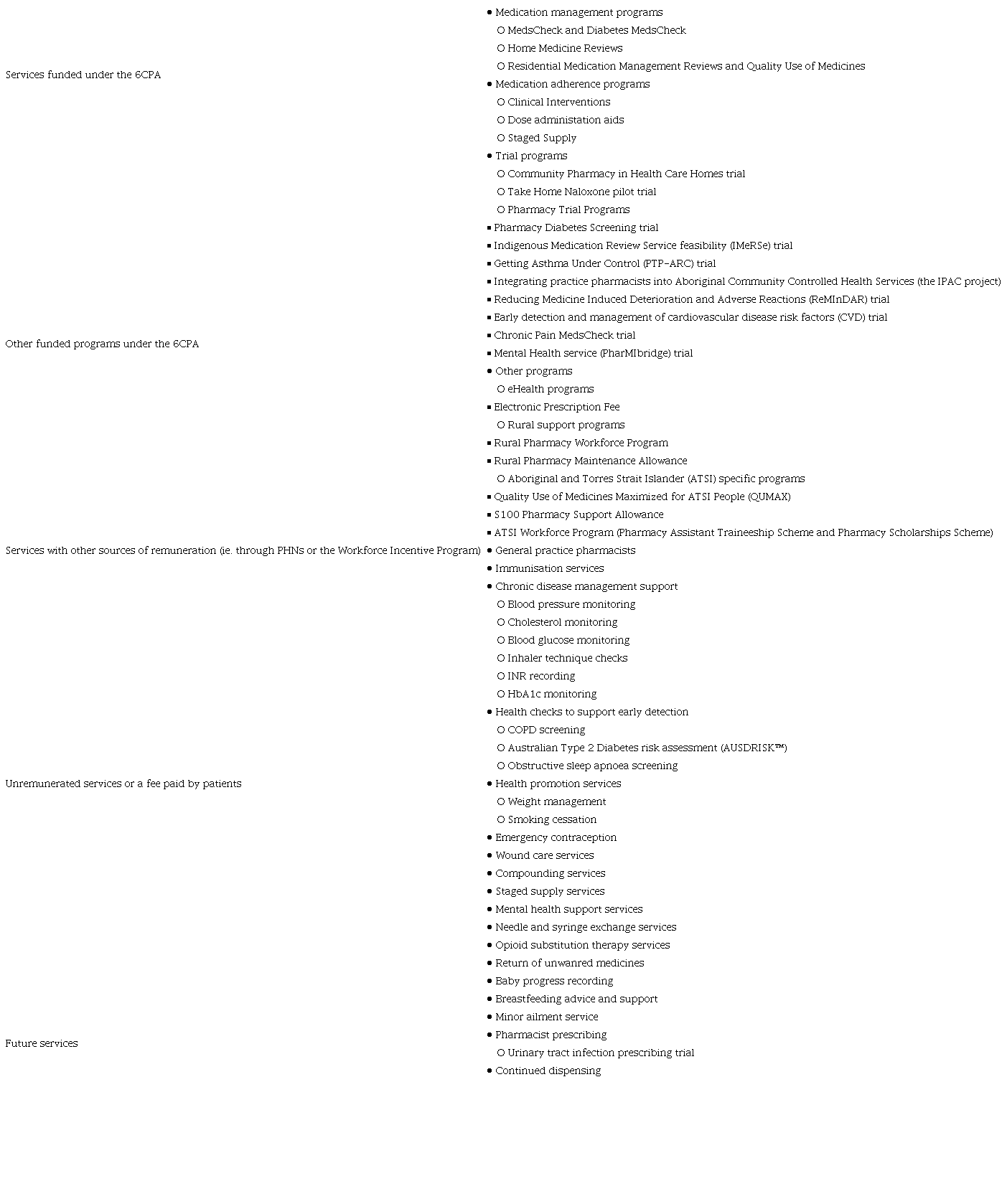 Australian pharmacists have long provided services to patients. 13, 53- 57 The 2018 Pharmacy Barometer report indicated that 19% of community pharmacy owners (one-fifth) employ a pharmacist solely dedicated to the provision of pharmacy services. 58 Services can be divided into those funded by the 6CPA, and services with other sources of funding (i.e., PHNs, or services paid for by the patient) ( Table 1).