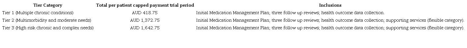 Community Pharmacy in Health Care Homes trial: (an initiative funded to support the incorporation of medication management programs within Health Care Homes). A Health Care Home is a general practice (or Aboriginal Community Controlled Health Service) that coordinates care for patients with chronic and complex conditions. 38 Pharmacies involved in the trial work in conjunction with the Health Care Home team by delivering patient-centred medication management services until the trial concludes on June 30 th 2021. Community pharmacy’s role in Health Care Homes is to conduct an initial medication reconciliation of a patient’s medicines, and develop a Medication Management Plan. The plan includes (1) goals of medication therapy (i.e., proposed plan of action), (2) person responsible for the identified goal (eg. patient, pharmacist, or GP), (3) identification of medication adherence and management services (e.g., blood pressure monitoring, blood glucose monitoring, dose administration aids, or development of an asthma action plan), (4) reconciled medication list, and (5) proposed review date. Each patient is assigned to a complexity tier and pharmacies are remunerated accordingly ( Table 2). 66, 67 However, there appears to be no publicly available data on the uptake of the program.