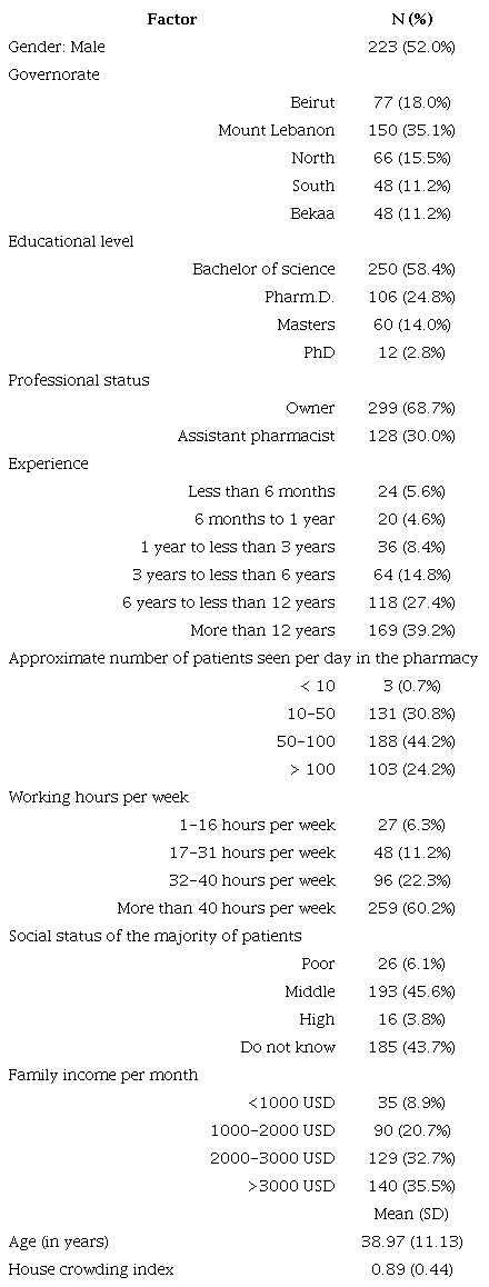 Methods: This cross-sectional study was conducted between March and July 2018. A proportionate sample of 435 community pharmacists was selected from all regions of Lebanon. A standardized self-administered questionnaire, distributed by trained interviewers, was used to assess the studied variables.