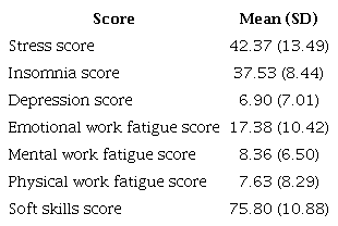 The scores of the scales included in the survey are presented in Table 2. The emotional work fatigue score was the highest among fatigue scores. The remaining scores, such as stress, insomnia, and soft skills were high, while the mean of depression score (6.9) was less than 10, indicating no symptoms of depression among community pharmacists.