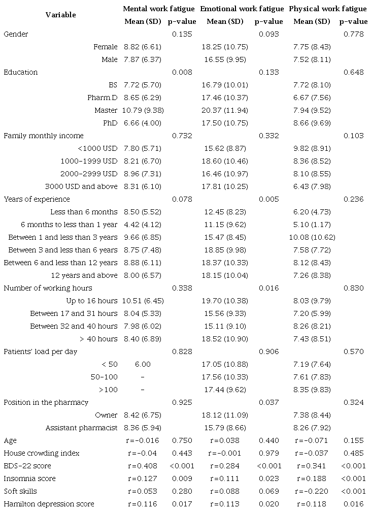 A significantly higher mean mental work fatigue was found among pharmacists with a Master’s degree compared to those with other degrees. Higher stress, insomnia, and depression were significantly associated with higher mental work fatigue.