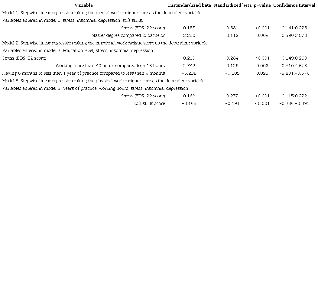 The data entry was carried out by a study-independent person, and statistical analysis was performed on SPSS version 23. The Student t-test was used to compare work fatigue and dichotomous variables, and the ANOVA test was applied to compare between 3 or more groups. Finally, a stepwise linear regression was computed by taking the scores of work fatigue subscales as dependent variables, and variables showing a significant association in the bivariate analysis as independent variables. A p<0.05 was considered statistically significant.