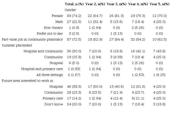 There were 139 responses (Response rate: 28%) and of these, 18 only provided demographic details and were removed. As such, 121 responses were analysed and of these, 102 answered all sections, while one did not provide demographic details. Mean age of respondents was 21.2 (SD=3.68) and 87 (72.5%) had a part-time job, while 56 (46.7%) did not undertake any summer placements. With regard to future areas they wanted to work in, five noted ‘other’ areas which included industry and research ( Table 2).