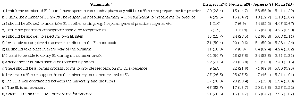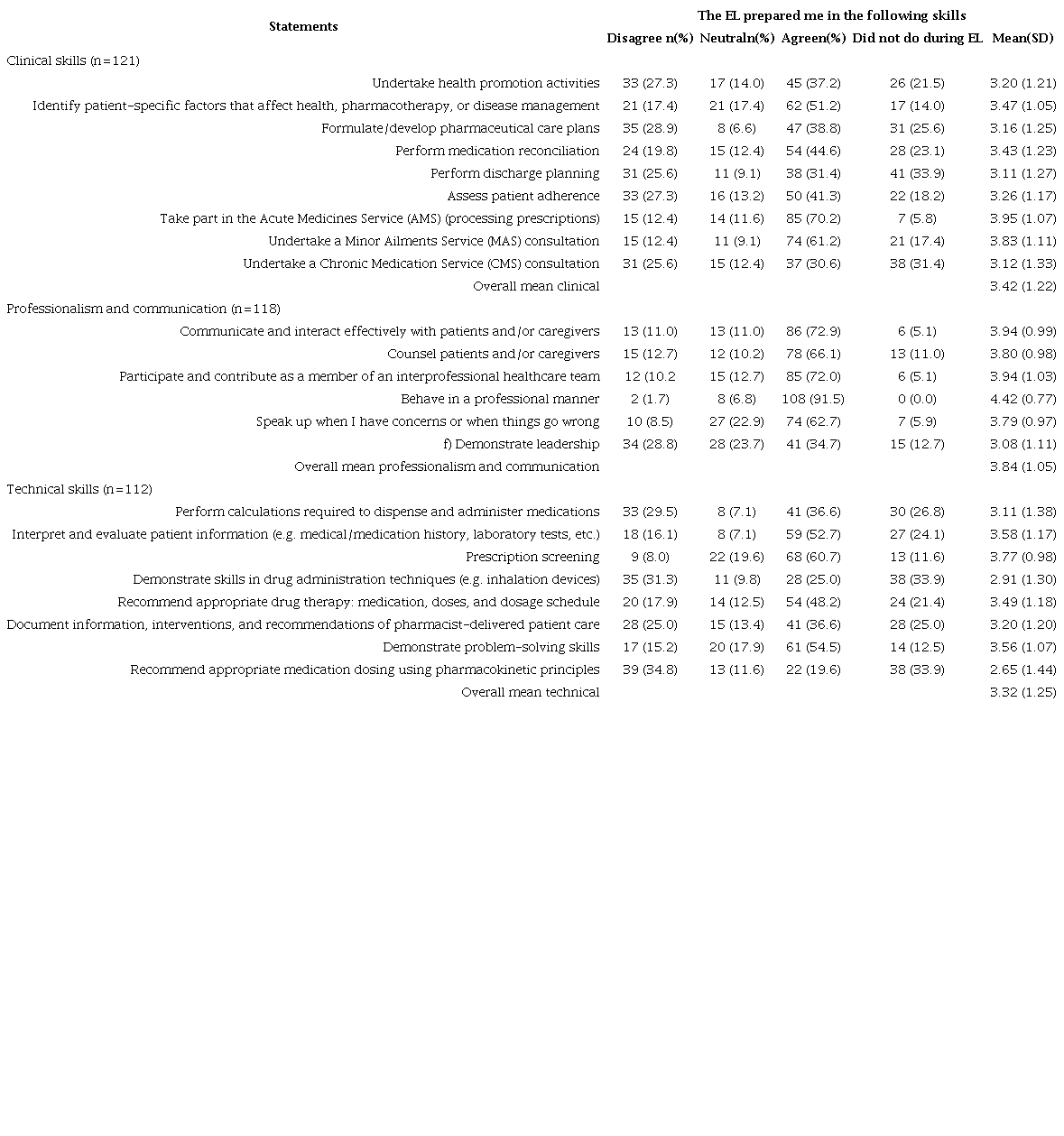 Results: From the 139 responses (response rate: 28%), 121 responses were analysed, and of these, 72.5% already had part-time jobs in community pharmacies. Close to 85% felt that their part-time work should contribute to EL hours, which is currently not recognised by the university. Respondents were positive about the effectiveness of EL in developing their professionalism and communication (M=3.84, SD=1.05), clinical (M=3.42, SD=1.22), and technical skills (M=3.32, SD=1.25) Respondents provided favourable feedback about their experience in the hospital as it gave them a real-world exposure to the role of a hospital pharmacist. Community placements were not viewed favourably and this was mainly attributed to the poor experience with tutors whom they felt used them as an extra pair of hands. This was thought to impede their learning experience. They also felt that hospital placements were of insufficient duration, reported by 72.5% of respondents. Respondents also felt they should be sent to other sites such as primary care for placements.