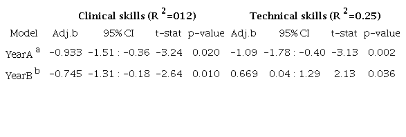 Overall, students were positive about the effectiveness of EL in developing their professionalism and communication, clinical, and technical skills ( Table 3). General linear regression found that Year 3 and Year 4 students had significantly more negative views about the effectiveness of EL in developing their clinical skills compared to those in Year 2. With regard to the effectiveness of EL in developing their technical skills, Year 3 students had significantly more negative views while Year 4 students had significantly more positive views, compared to those in Year 2 ( Table 4).