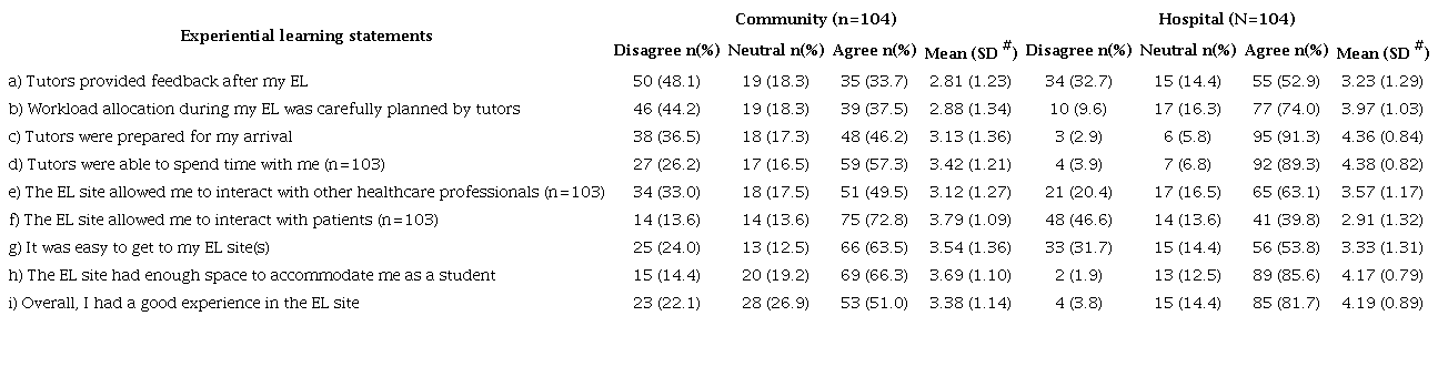 Calculation of mean revealed that students were more positive about their experience with tutors at the hospital (M=3.79, SD=1.18), compared to the community (M=3.30, SD=1.27). Students were ambivalent with regard to the preparedness of tutors in the community, as well as their perception of their overall experience in the community setting ( Table 5). General linear regression found no significant relationship between feedback on tutors and placement site, and the independent variables. With regard to structure and coordination, overall perception was neutral (M=3.39, SD=1.27). More than 70% disagreed that hospital attachments were sufficient, while more than 80% agreed that their part-time work should contribute toward their EL hours ( Table 6).
