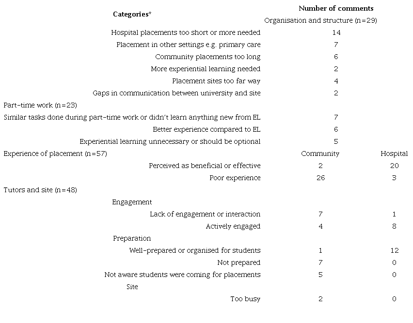 Forty-five students left open-ended comments, with five, 18, 12, and 13 comments from Years 5, 4, 3 and 2 respectively. Responses were an average of 93 words, with a range of 19 to 210 words. There were nine positive and 72 negative comments about community placements, with the latter mainly related to placement experience and tutors. For the hospital settings, there were 40 positive comments and 13 negative comments with the majority highlighting the limited duration of attachment. The number of comments according to the different categories is illustrated in Table 7.