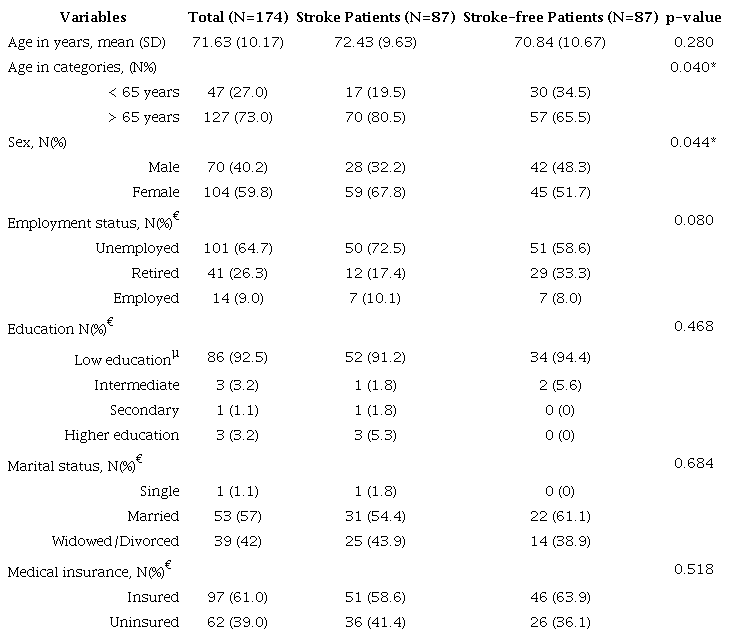 The mean age of stroke was 72 (SD 10) years. Stroke patients statistically differed from stroke-free patients in regard to age (>65 years) and sex (female). The majority of stroke patients were unemployed, married, medically insured, and had a lower education level (Table 1).