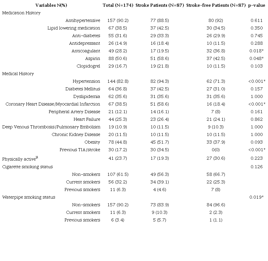 Stroke patients statistically differed from stroke-free patients in respect to anticoagulant, aspirin, and clopidogrel medications. They also differed in regard to medical history including hypertension, diabetes, coronary heart disease/myocardial infarction, peripheral artery disease, previous TIA/stroke, and family history of stroke as well as physical activity, waterpipe smoking (Table 2). Stroke patients also showed significantly higher values of blood pressure than stroke-free patients.